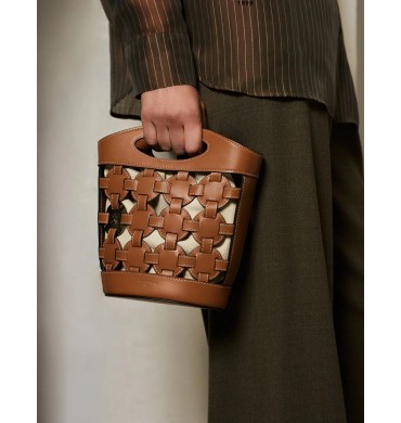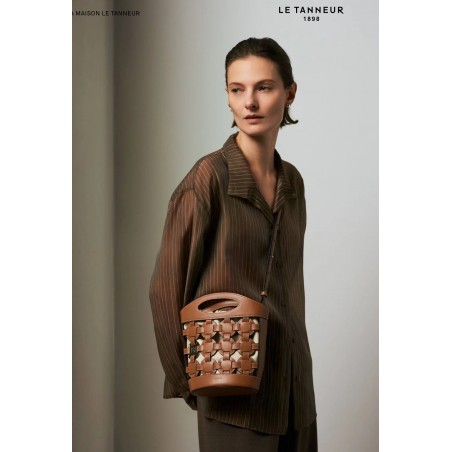 Petit sac seau bi-matière avec cordons de serrage et pièce signature gravée finition doré clair. Pochon coton amovible fixée au corps du sac par boutons-pression. Porté main, épaule ou croisé grâce à sa bandoulière ajustable et amovible.
